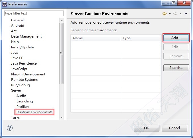點選 Menu: Window > Preferences, 移到 Server > Runtime Environments, 按 "Add" 鈕 :